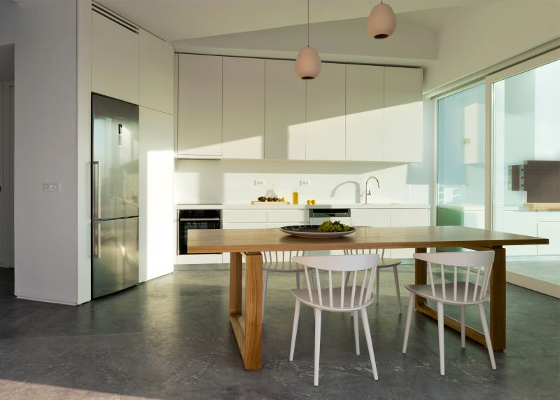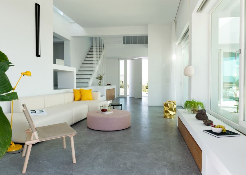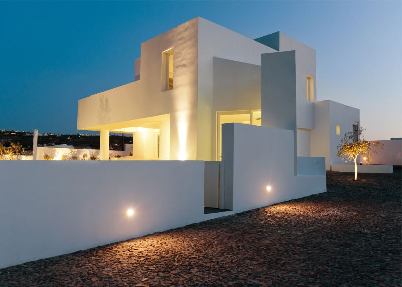 Energy Saving solutions of ANDRIANOS used to efficiently heat and cool a white bright summer house in Santorini that reflects the traditional architecture of the Greek island houses.