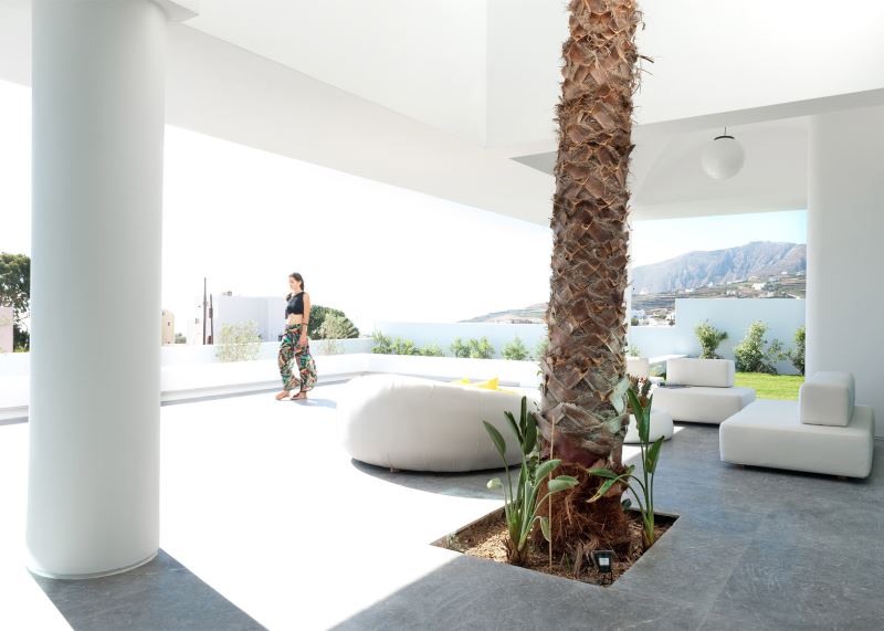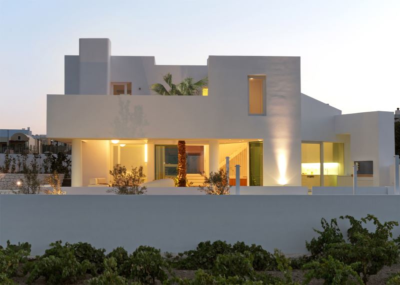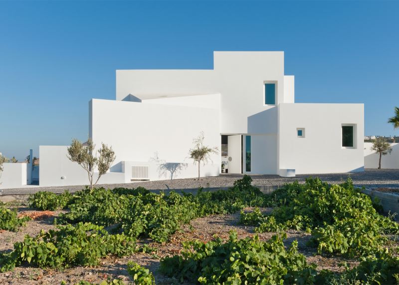 The residence is a family retreat on a sloping site on the outskirts of Mesaria. Each room in the house is contained in a white squared block that is stacked irregularly to give the home a completely asymmetrical shape. This layout offers panoramic views of the sea to the northeast, the village of Pyrgos to the south, and a small garden oriented to the southeast.