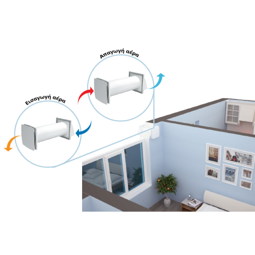- Οι αθόρυβης λειτουργίας συσκευές, στην 1η ταχύτητα 27 dB(A) και στην 2η ταχύτητα 29 dB(A), μπορούν να εγκατασταθούν στα περιμετρικά τοιχώματα της κατοικίας και έχουν ένα μεταβλητό μήκος από 250 έως 400mm.