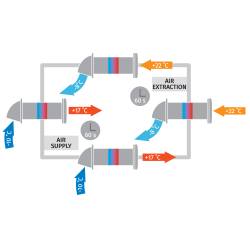Ο εναλλάκτης αέρα-αέρα με ανάκτηση θερμότητας VENTO SOLO A60 V2 της BLAUBERG, είναι ένα σύστημα αερισμού των εσωτερικών χώρων, για το οποίο δεν απαιτούνται κανάλια. Εξασφαλίζει την παροχή καθαρού φρέσκου αέρα, με την απαγωγή και προσαγωγή αέρα εναλλάξ, ενώ ταυτόχρονα διατηρεί τη θερμότητα του χώρου, χάρη στον κεραμικό εναλλάκτη που διαθέτει με απόδοση έως 85%. Επιπλέον, εξασφαλίζει ισορροπία στα επίπεδα υγρασίας στο χώρο χάρη στον ενσωματωμένο αισθητήρα υγρασίας.